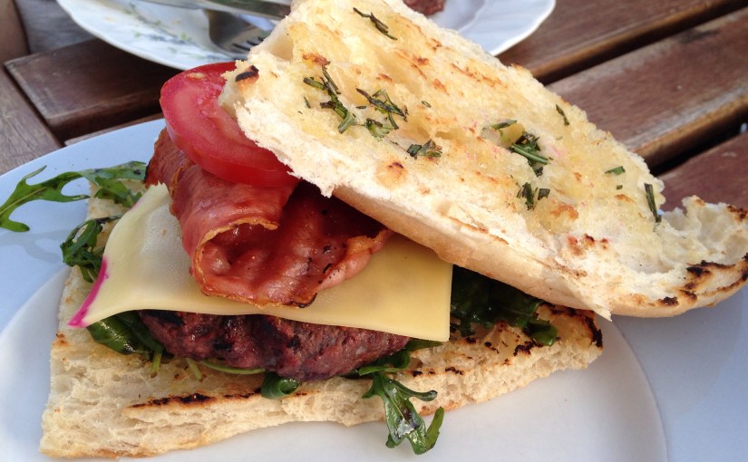 Hier noch ein kleiner Überblick über die Zutaten: Wir haben Ruccolasalat mit Öl, Balsamico, Salz und Pfeffer gewürzt. Dazu kamen dann noch Tomaten, Gouda, rote Beete und Serrano-Schinken. Den Schinken haben wir auch kurz auf den Grill geworfen, so wird er schön kross. Wenn die Burger durch sind, legt man die mit der Butter bestrichenen Brotstücke kurz zum Anrösten auf den Grill. FERTIG und LECKER! Meine Gäste haben gesagt, sie kommen auf jeden Fall nochmal wieder! Und das ist doch das beste Lob, da vergisst man eine geklaute Flasche Wein auch schnell…