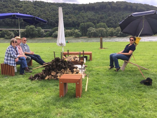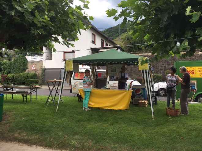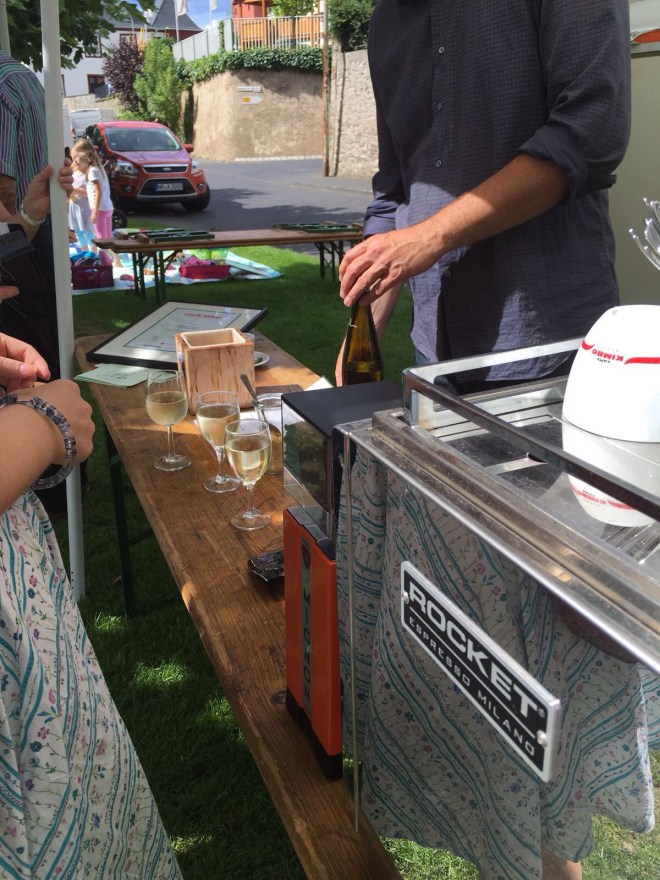 Überall entlang der Rheinpromenade haben die Winzer aus Leutesdorf ihre schlichten Stände aufgebaut. Alle paar Meter findet sich ein anderes Weingut. Hier können die fröhlichen Picknicker ihren flüssigen Proviant kaufen. Per Flasche oder Glas.