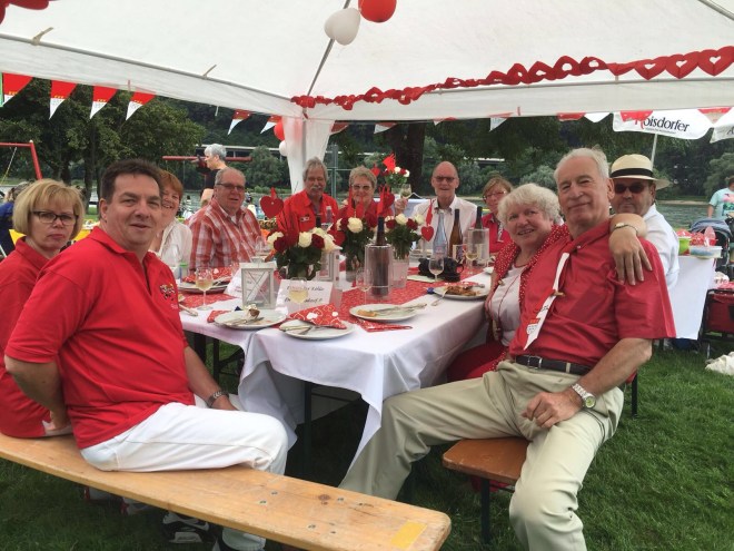 Die erste Gruppe sticht direkt ins Auge – Rut un Wieß – die können doch eigentlich nur aus Köln sein! Und tatsächlich: Der Freundeskreis „Madämcher un Häre us Kölle“ kommt schon seit Jahren gern zum Weinpicknick. Im letzten Jahr konnten sie mit ihrer Tischdeko sogar den 3. Platz ergattern. Denn das Weinpicknick funktioniert so…