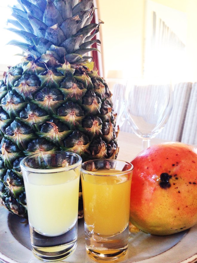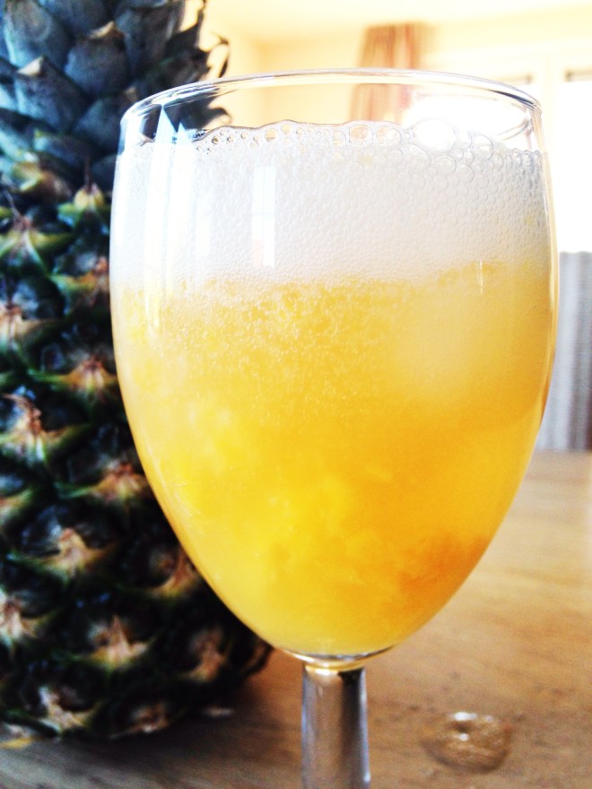 Am besten alle Zutaten (ausser Champagner) zusammen in den Cocktail Shaker packen und einmal kräftig durchschütteln. Dann ab ins Glas und mit Champagner (oder Sekt) auffüllen. Wer es sich noch hübscher und noch gesünder machen will, der hängt oben an den Glasrand noch ein Scheibchen Ananas. Kommt auch gut!