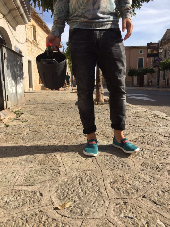 Inside it smells like old and vinegar. Big warn out bottles are stacked left and right of the barrels. Total cellar atmosphere. No fancy tasting area in sight. In the rear a lady fills wine from a barrel into a cask. Our short tasting seems more like a scene from a silent movie due to the lack of a shared language. But inspite of our poor Spanish knowledge we manage to buy a 4 litre bottle „sang de bou“. We pay not more then 10,40 Euro. 3 Euro deposit for the mega-bottle are already included. Only later , when talking to a Majorcan who knows some English, I find out what it means: „Bull’s Blood“. And indeed the taste of this thick dry redwine truly is a bit metallic.