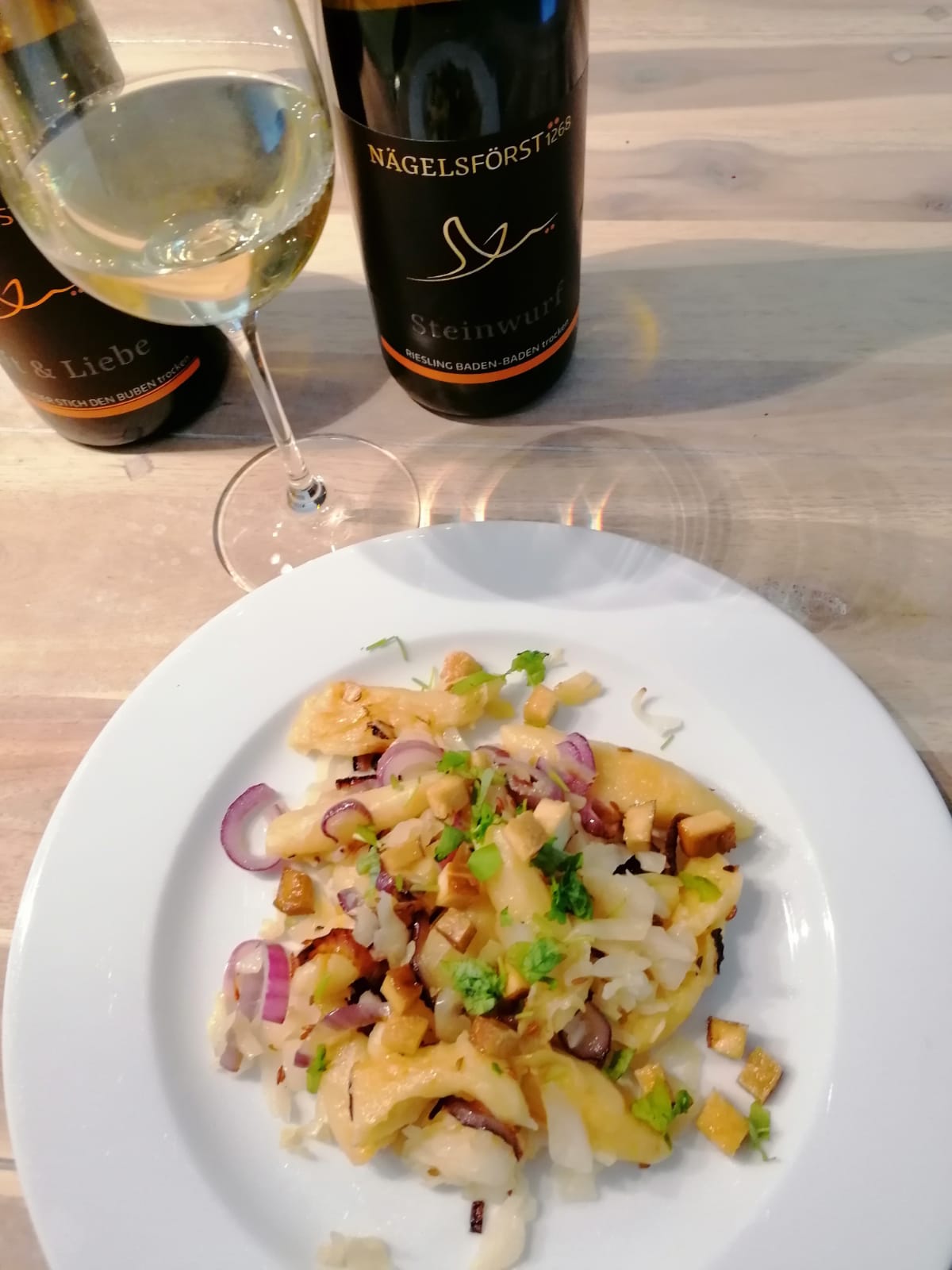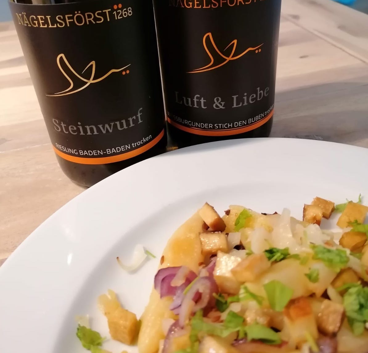 Da wir heute davon nicht satt werden muss uns der Wein jetzt einfach beweisen, dass er es besser kann als der Riesling. Und siehe da, er kann! Allein vom Geruch her, aber natürlich auch beim Trinken passen sich die Aromen dieses Weins besonders an die Cremigkeit der Schupfnudeln an, unterstreichen mit einer zarten Rauchnote die leicht salzigen Röstaromen des Tofu und geben der ätherische Würzigkeit der Kümmelkörner den nötigen Raum. So lässt es sich auch von Luft & Liebe leben 😉