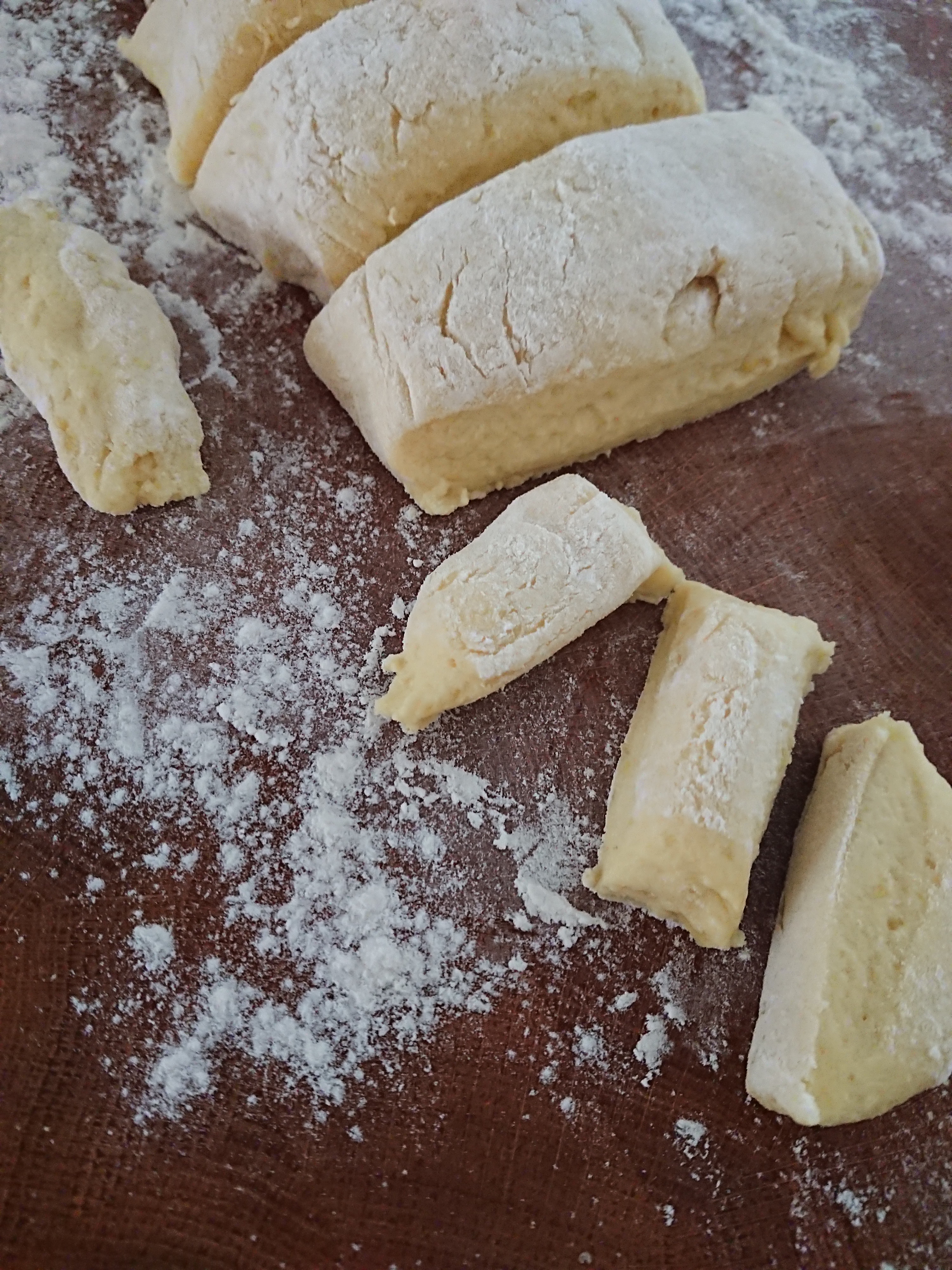 Daraus 4-5 gleichgroße „Rollen“ mit einem Durchmesser von rund 4 cm machen. Von diesen Rollen kleine Teigstückchen abschneiden und mit den Handflächen zu Schupfnudeln formen. (Form muss nicht perfekt sein.)