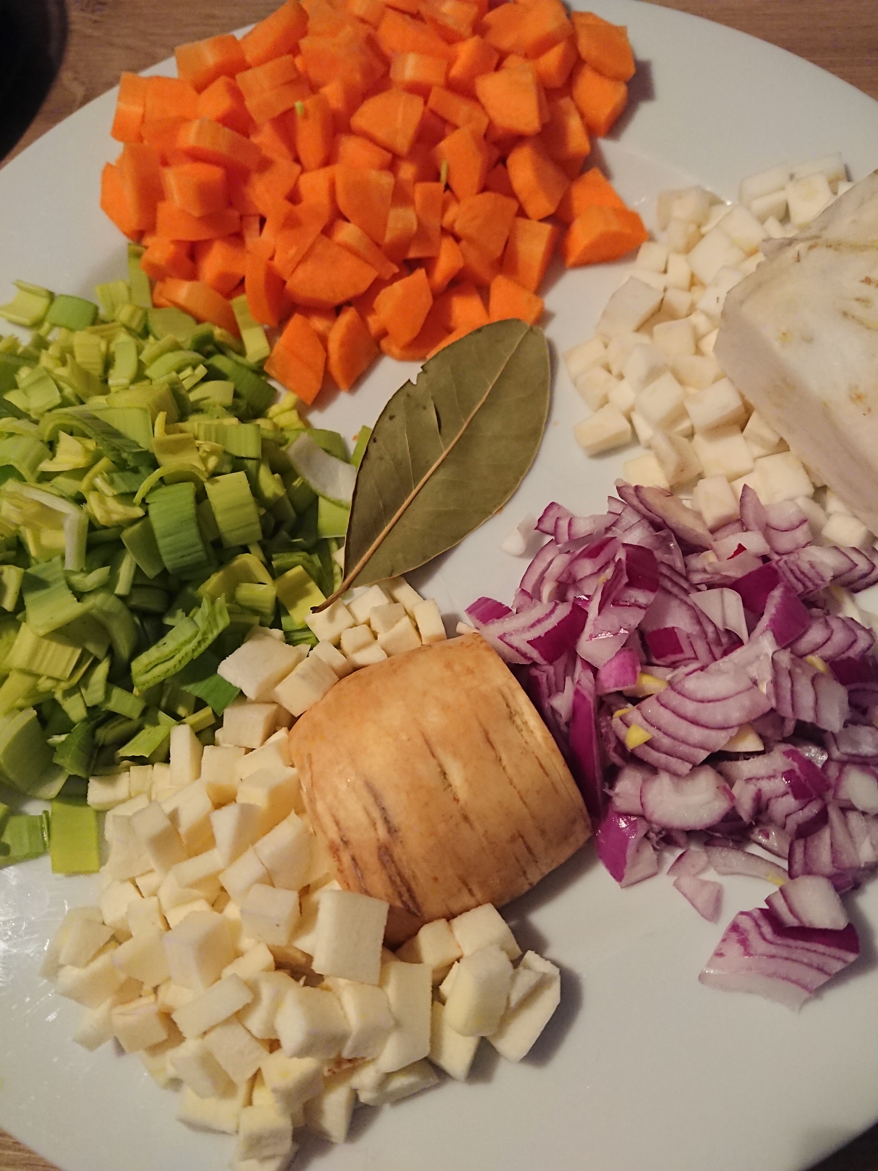 Möhren, Pastinake, Lauch, Zwiebel und Sellerie in kleine Würfel schneiden und mit etwas Öl anbraten. Mit Brühe ablöschen und Linsen und das Lorbeerblatt hineingeben. Linsenmischung rund 30 Minuten köcheln lassen (je nach Linsenart und ob sie vorher eingeweicht waren).