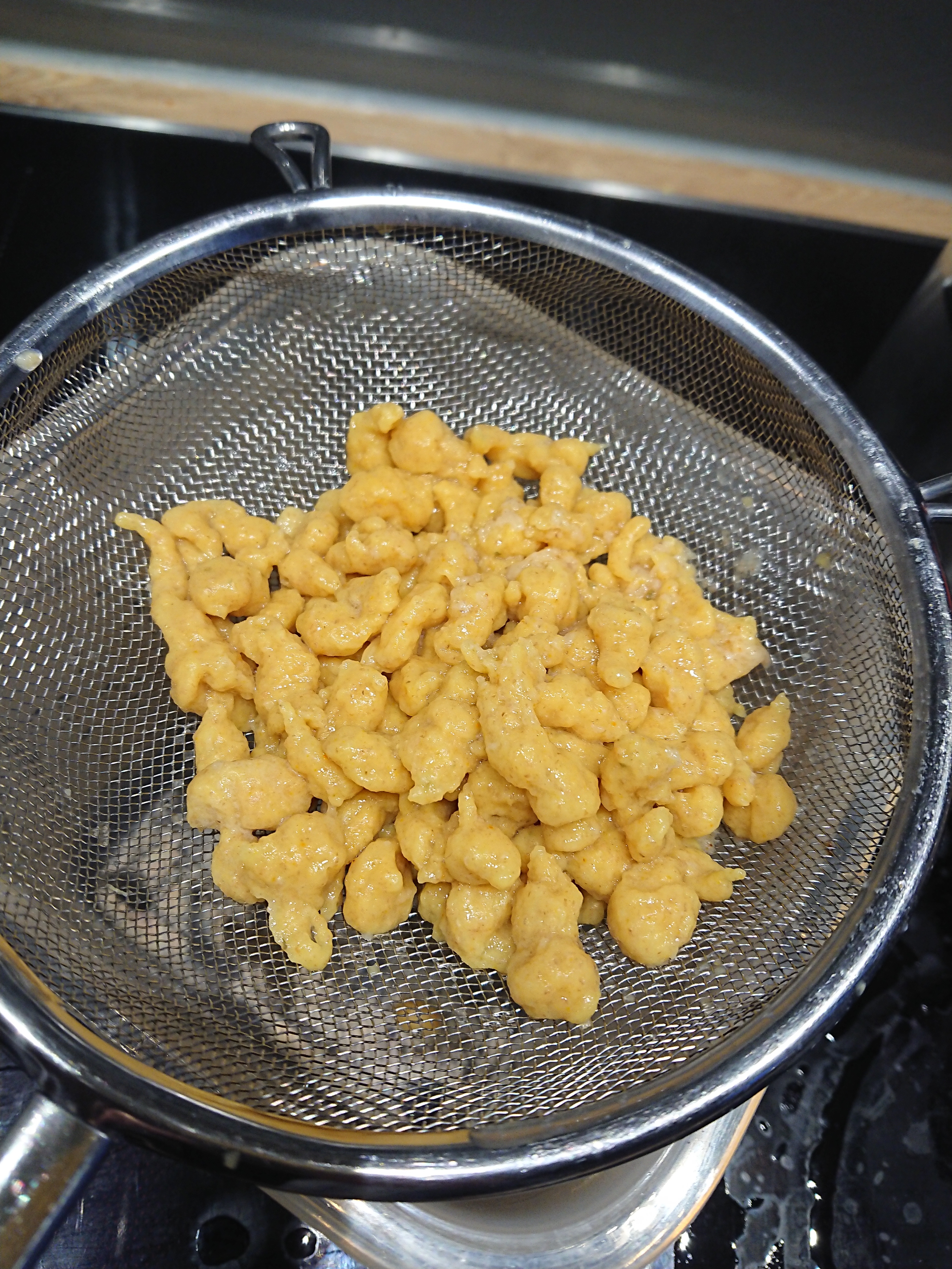 Zurück zu den Spätzle: Spätzleteig durch ein grobes Sieb oder eine spezielle Presse in kochendes Salzwasser scharben. Kommen sie an die Wasseroberlfäche, noch etwa eine halbe Minute sieden lassen und dann mit einem Schöpflöffel herausholen. Abtropfen lassen. Wer mag kann seine Spätzle anschließend noch in einer Pfanne rösten – sie werden so etwas knuspriger.