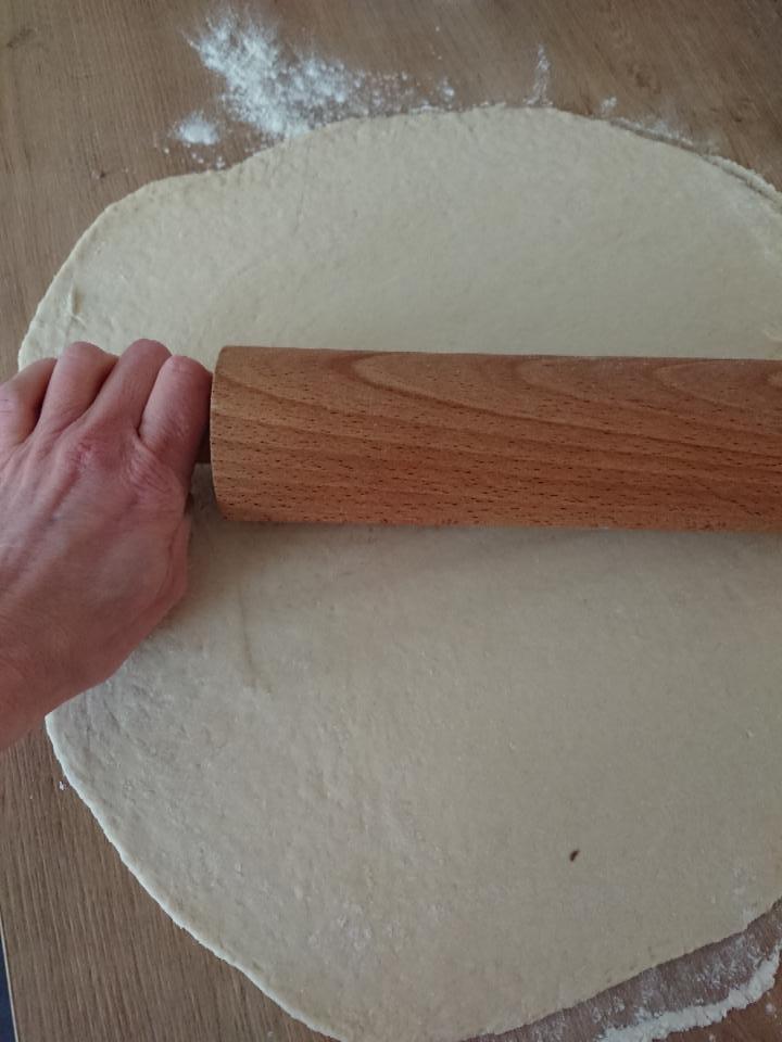 Ist der Teig aufgegangen mit dem Nudelholz ausrollen und die Lauchmasse gleichmäßig darauf verteilen.