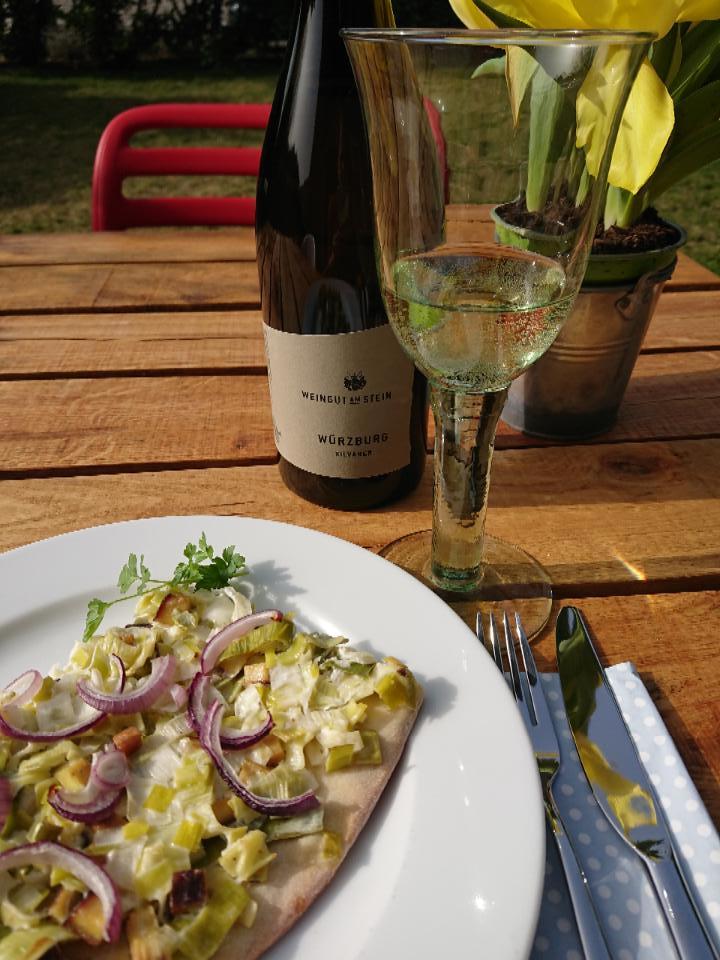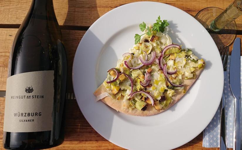 Zu unserem vegetarischen Lauchblootz trinken wir, wie sollte es in Franken anders sein, einen Silvaner. Der Würzburger aus dem hochmodernen Weingut am Stein ist ein im Edelstahl ausgebauter Bio-Wein mit 12,5 % Alkohol.