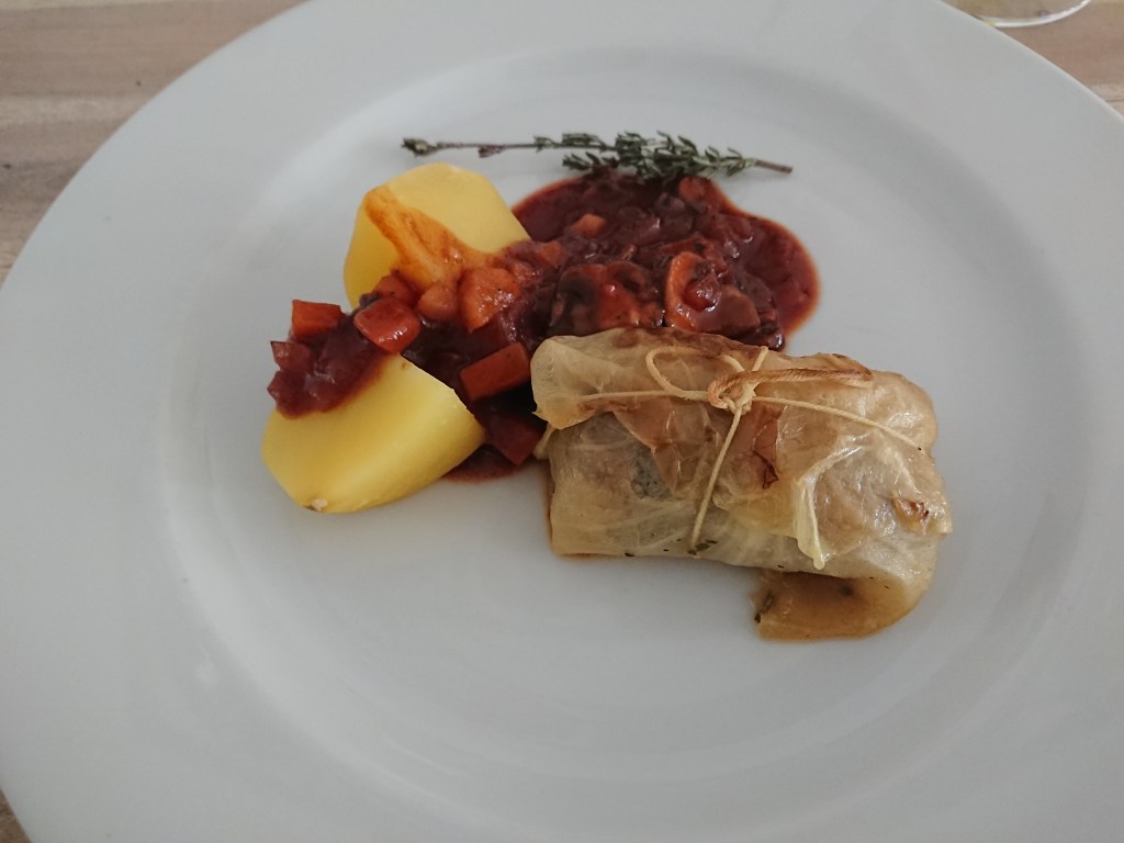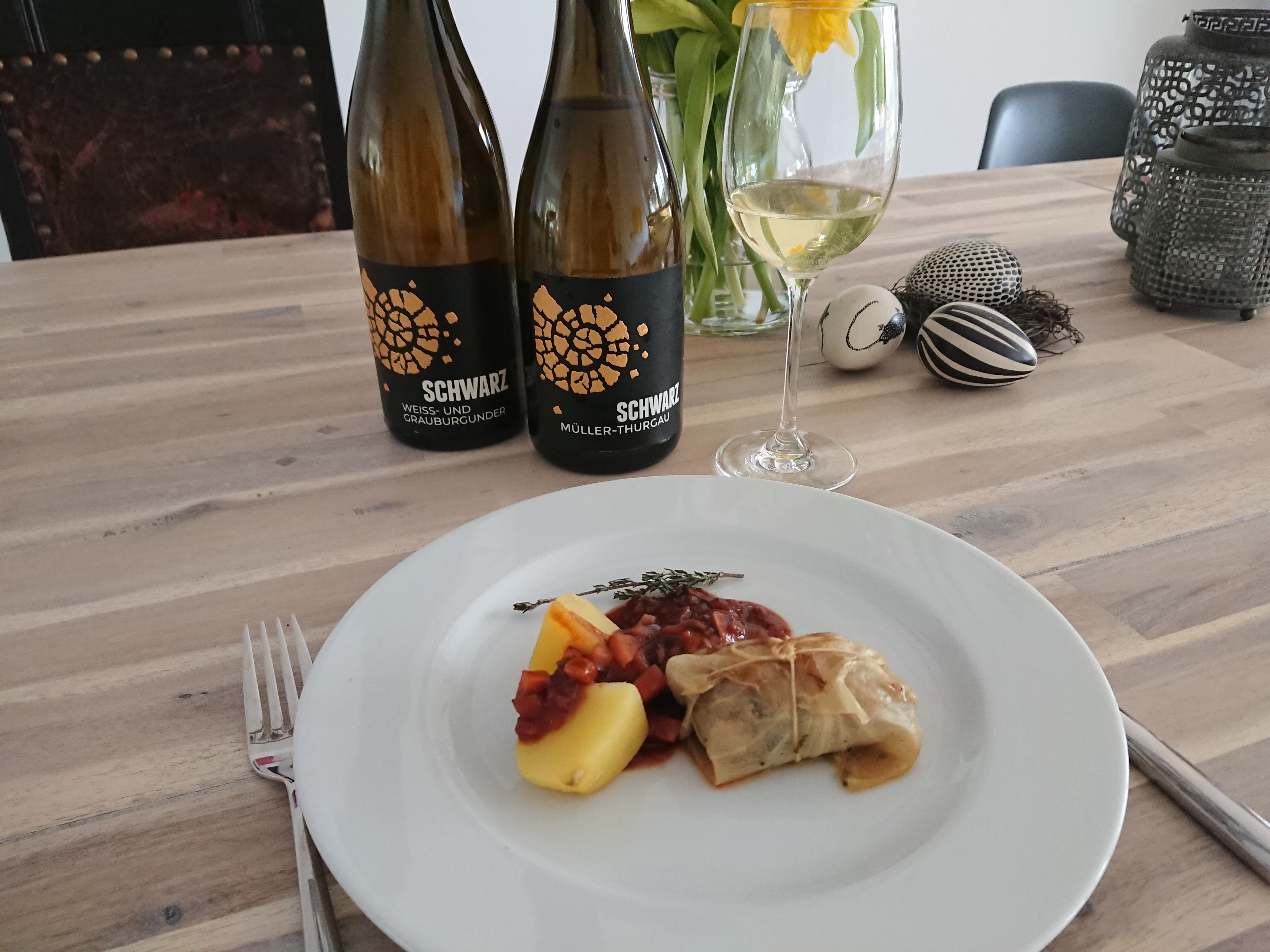 Passend zum Aprilwetter ein echt interessantes Pairing mit den sehr vielschichtigen Aromen der Kohlrouladen und der dazugehörigen Sauce.