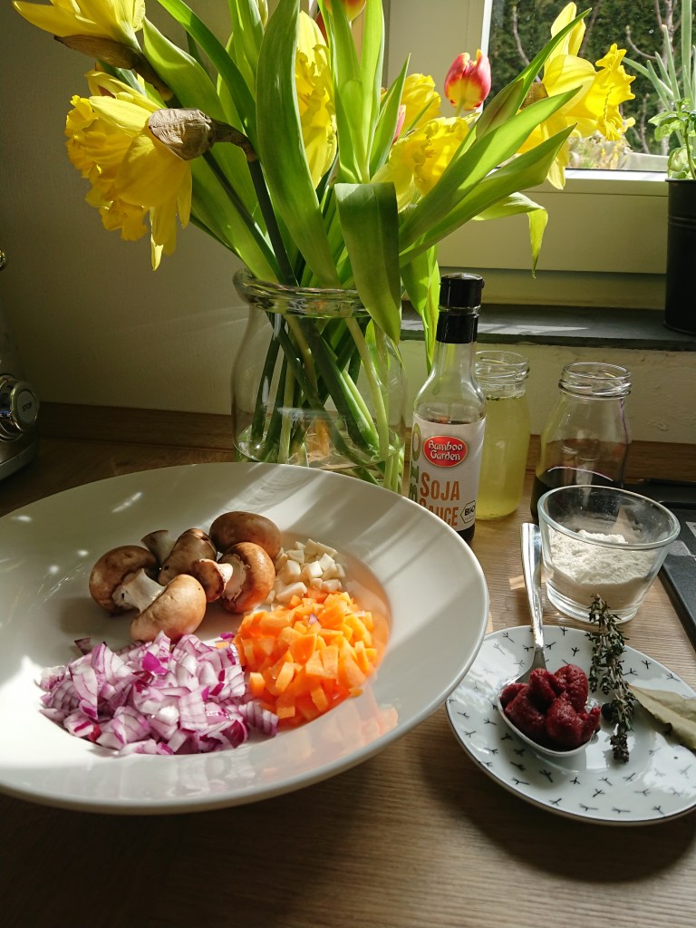 Die fruchtigen Noten des Müller-Thurgau hingegen haben gegen die fruchtigen Noten der Soße kaum eine Chance und lassen den Wein somit fast einsilbig erscheinen. Somit würde ich empfehlen den Müller-Thurgau vorab während des Schnippelns und Kochens als Aperitif zu genießen und die Cuvée zum Essen zu reichen. We ich finde ein rundes Konzept.