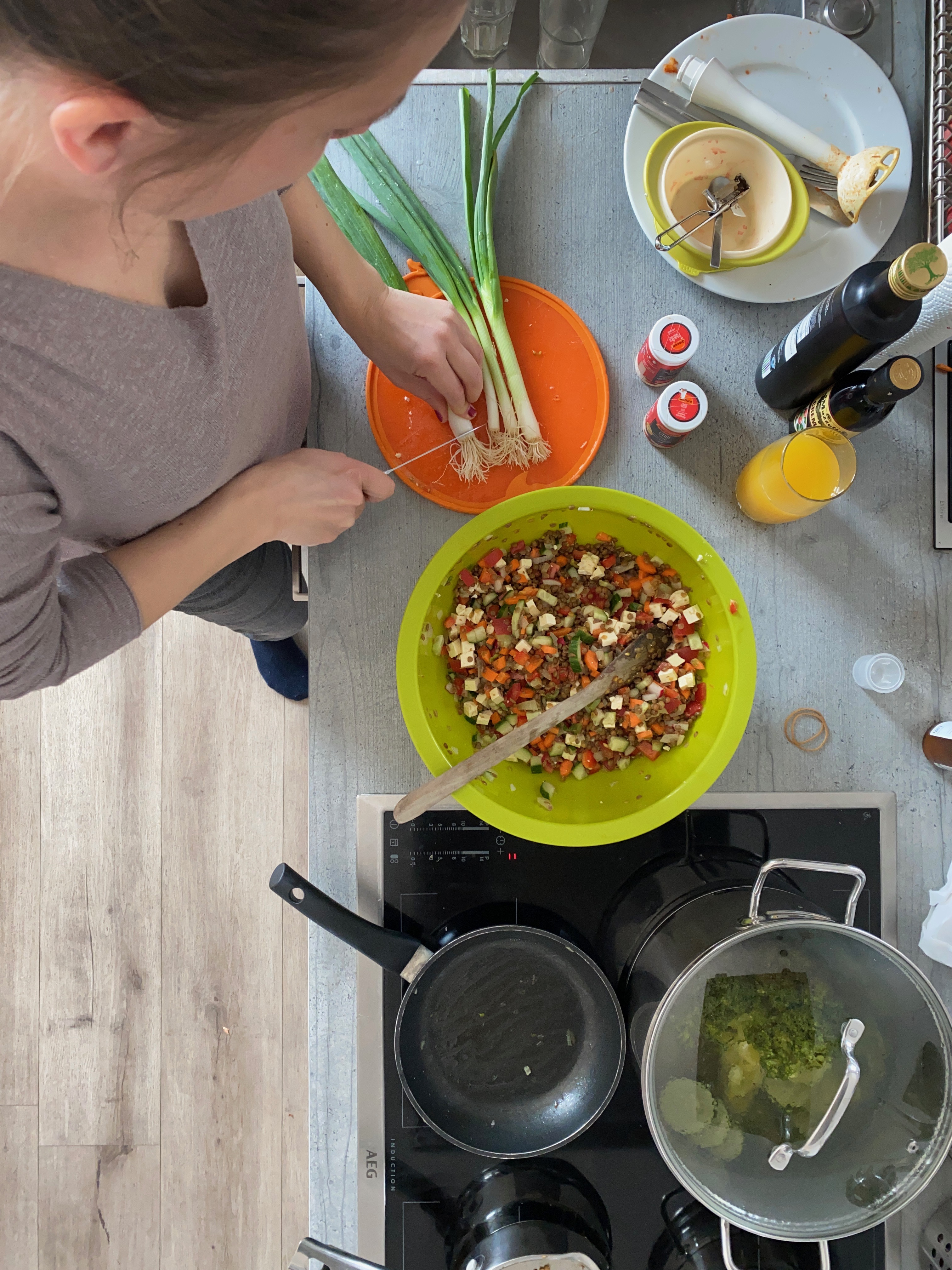 Cocktailtomaten waschen und vierteln. Paprika waschen, Möhren und Zwiebeln schälen und alles in kleine Würfel schneiden. Feta würfeln.