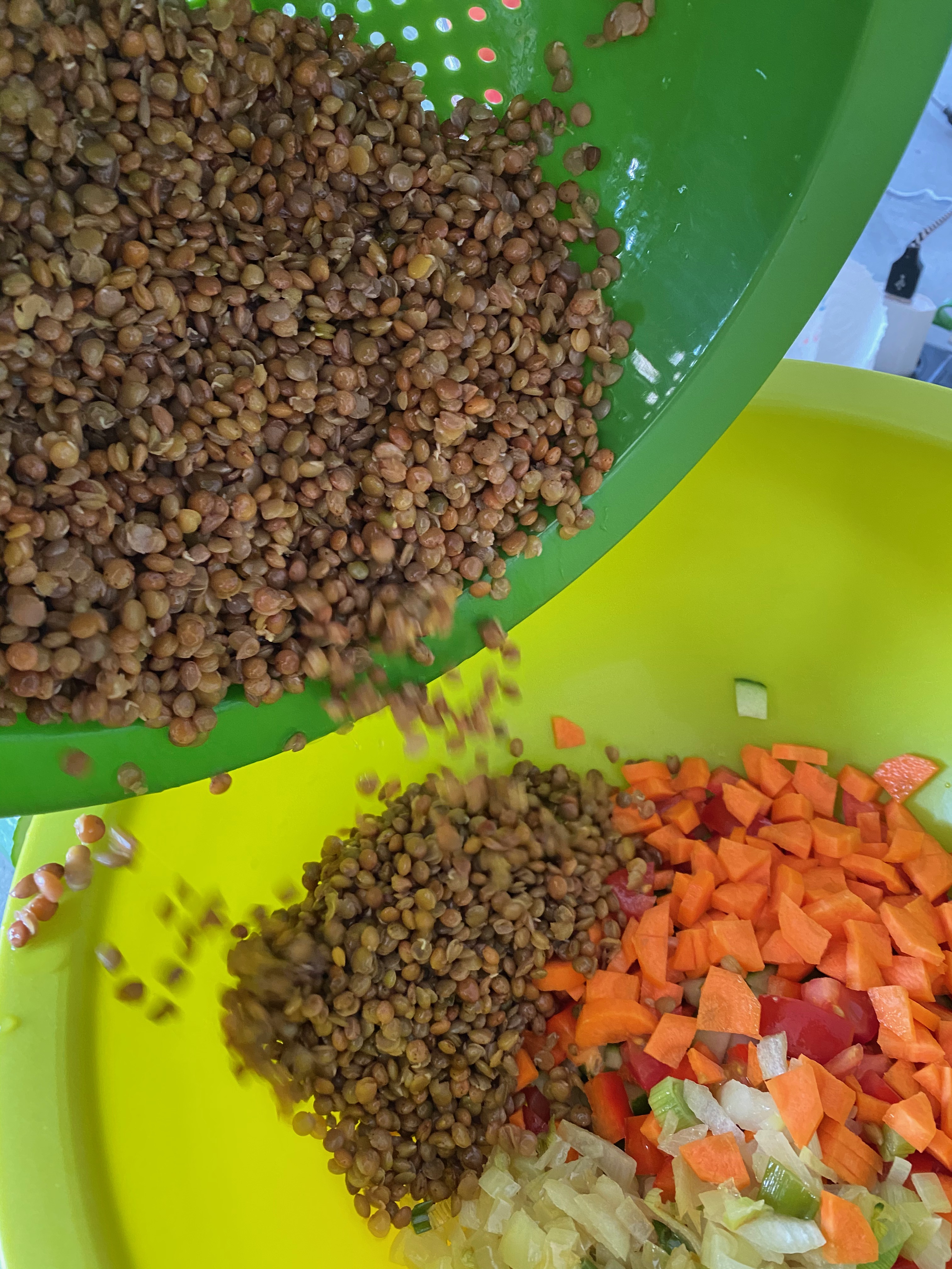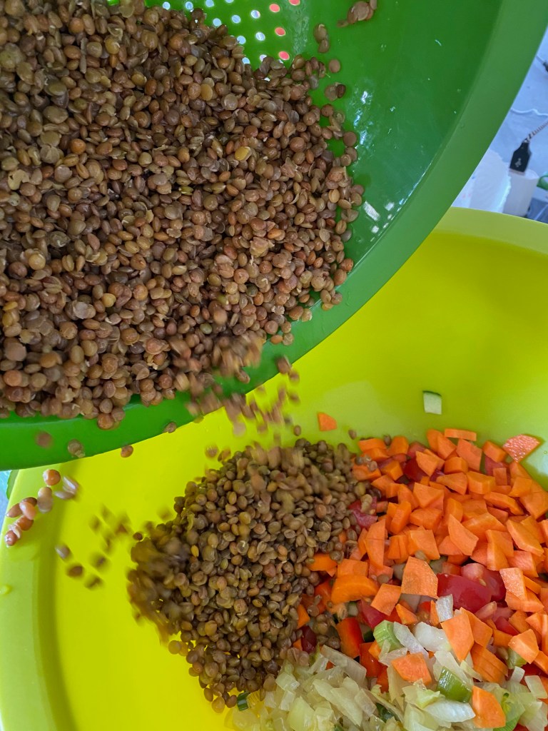 Die Linsen etwa 30 Minuten kochen, so dass sie noch bissfest sind. In ein Sieb abgießen und mit kalten Wasser abspülen. Erkalten lassen.