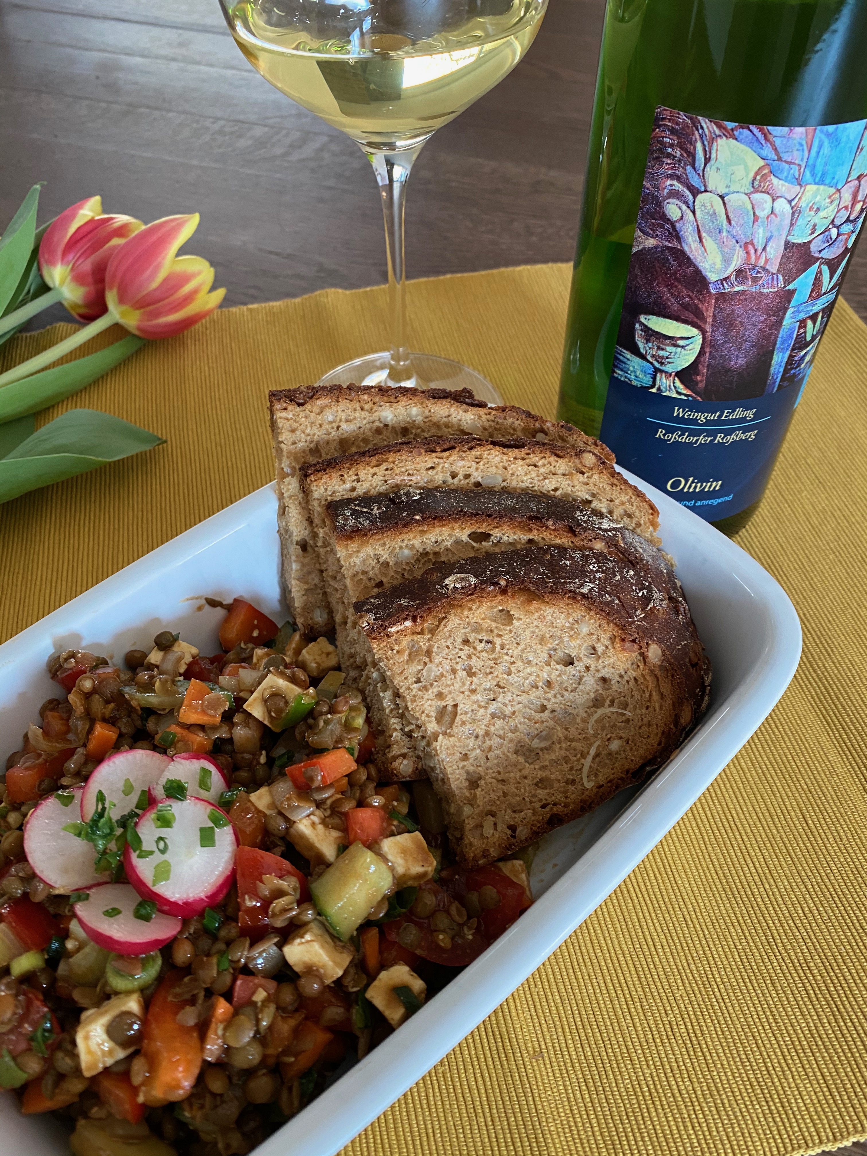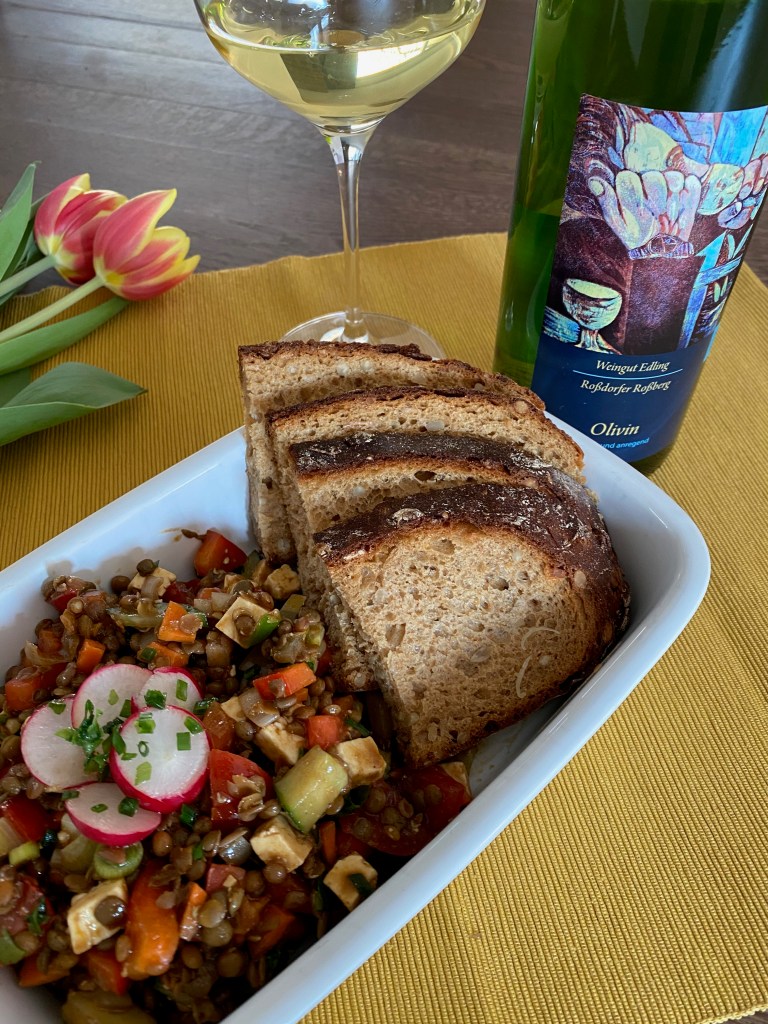 Zu unserem knackig-würzigen Linsensalat trinken wir – genau wie wie bei Familie Edling üblich – einen 2019er Roßdorfer Roßberg „Olivin“ feinherb. Der Olivin ist eine würzig frische Cuvée aus Riesling und Scheurebe. Durch die Balsamicocreme ist der Linsensalat leicht süßlich und durch Zutaten wie Zwiebeln, Knoblauch, Petersilie Radieschen und Frühlingszwiebeln sehr aromatisch. Zu der leichten Schärfe durch das Paprikapulver und die Chilliflocken genießt man besser einen Wein mit etwas weniger Alkohol, damit es nicht auf der Zunge brennt. Insofern passt der Weißwein mit seiner leichten Restsüße und der dennoch frischen, aber nicht zu aufmüpfigen Säure sehr gut ins Bild.