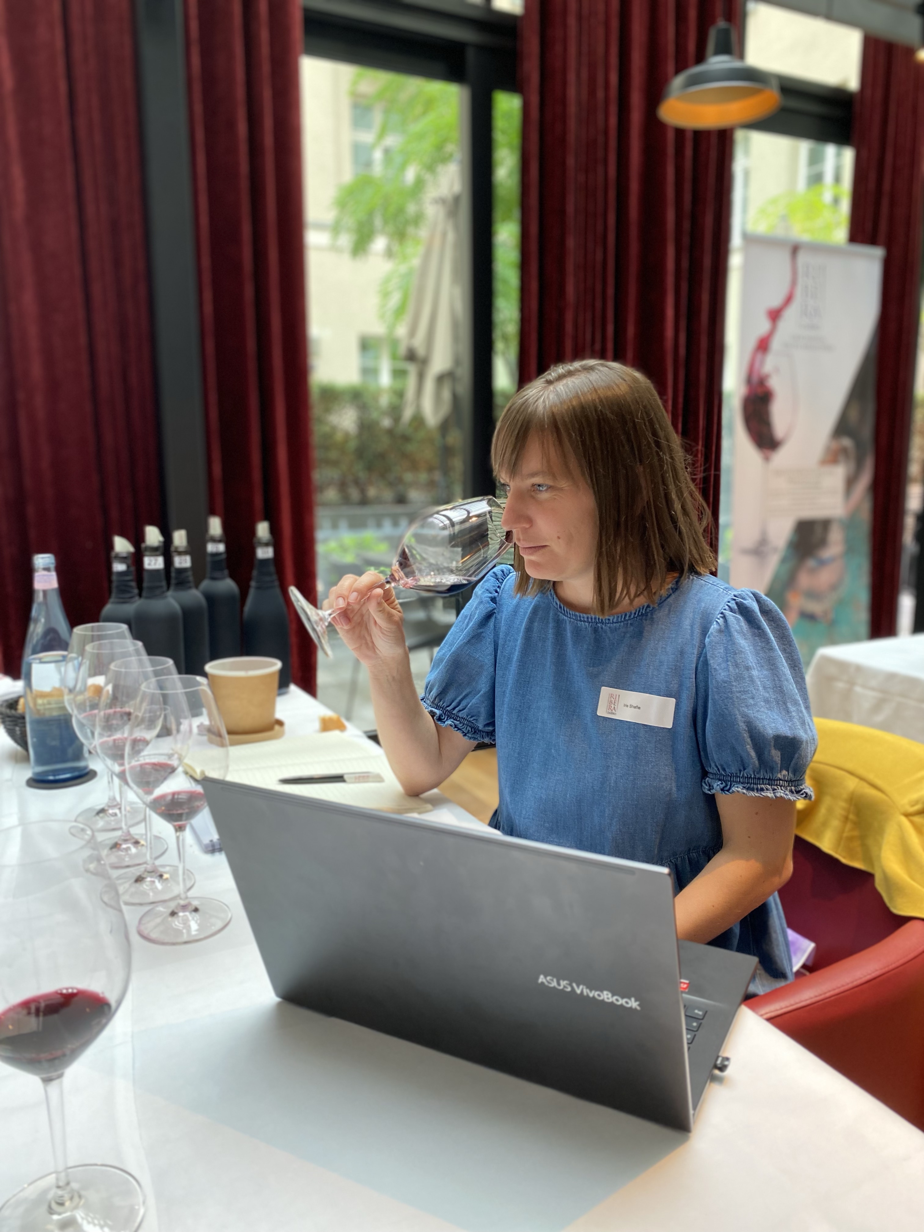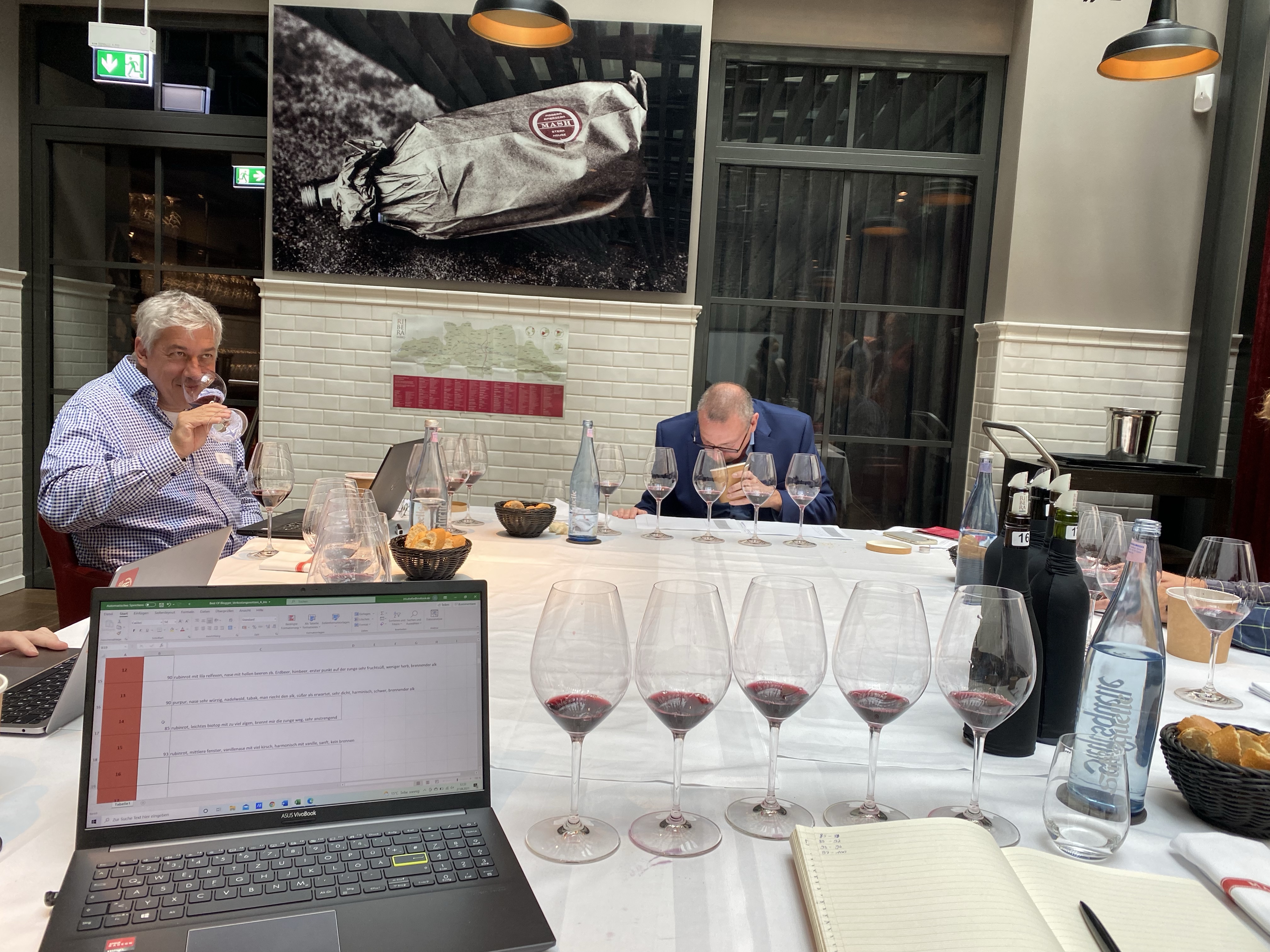 Gefragt war bei diesem Tagespensum natürlich das konzentrierte Arbeiten an Glas und Laptop. Alle Eindrücke wollten dokumentiert und gesichert werden. Bis auf das leise Surren der Klimaanlage hörte man nur hier und da ein zaghaftes Klirren, gefolgt von einem leisen Schlürfen. Geachtet wurde auf Farbe, Viskosität, Geruch, Geschmack und die Länge des Abgangs. Gibt es Fehltöne oder besondere Nuancen? Fehlt Frucht, wie hoch ist der Restzucker, wie kräftig die Tannine? Ausbau im Holz oder Tank? Wie viel Trinkfluss ist da?