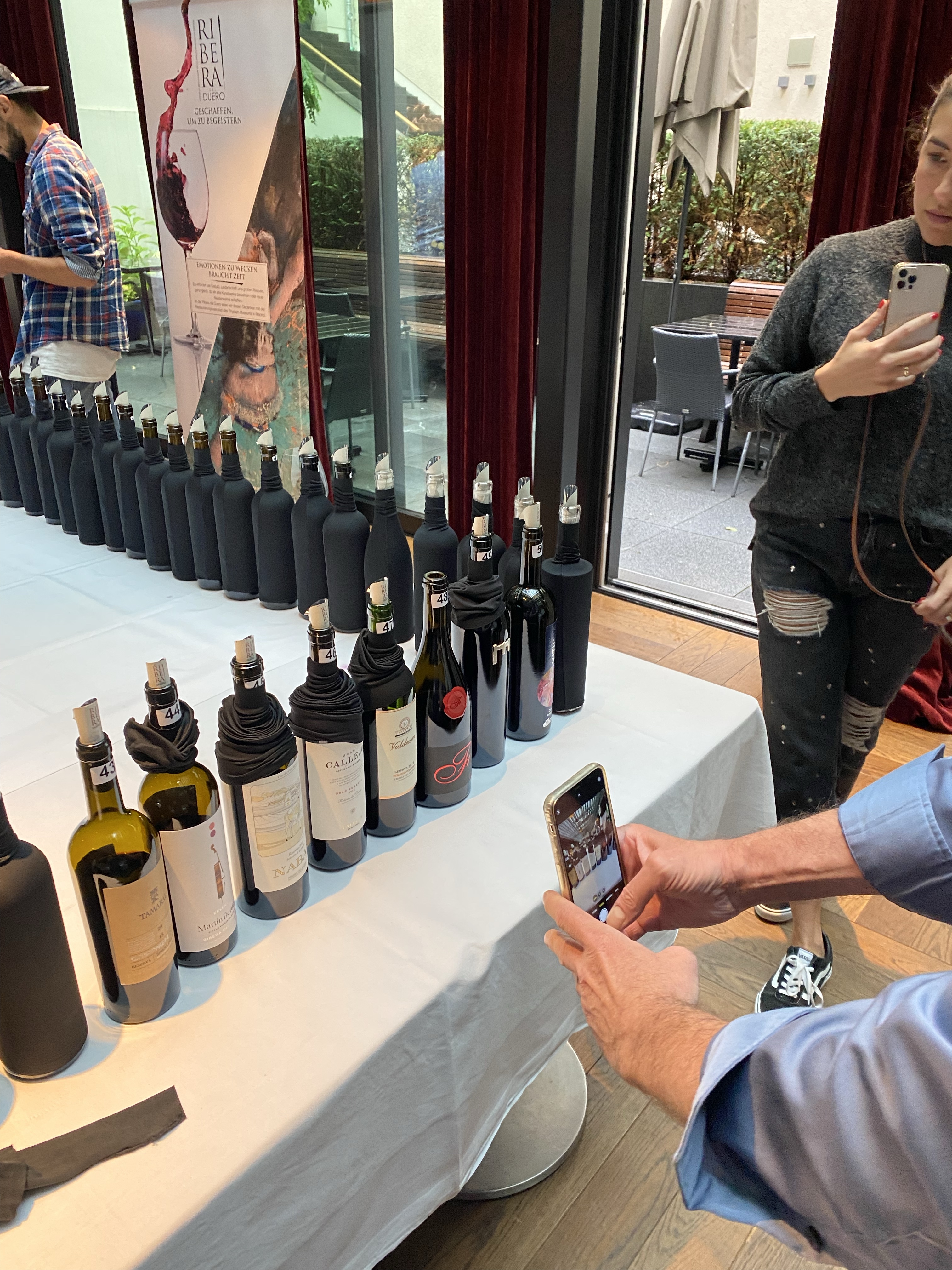 Das Betreten des Verkostungsraums war ein bombastischer Anblick! 100 exakt aufgereihte, mit schwarzem Stoffmantel überzogene und nummerierte Weinflaschen warteten in der Raummitte bereits auf uns.