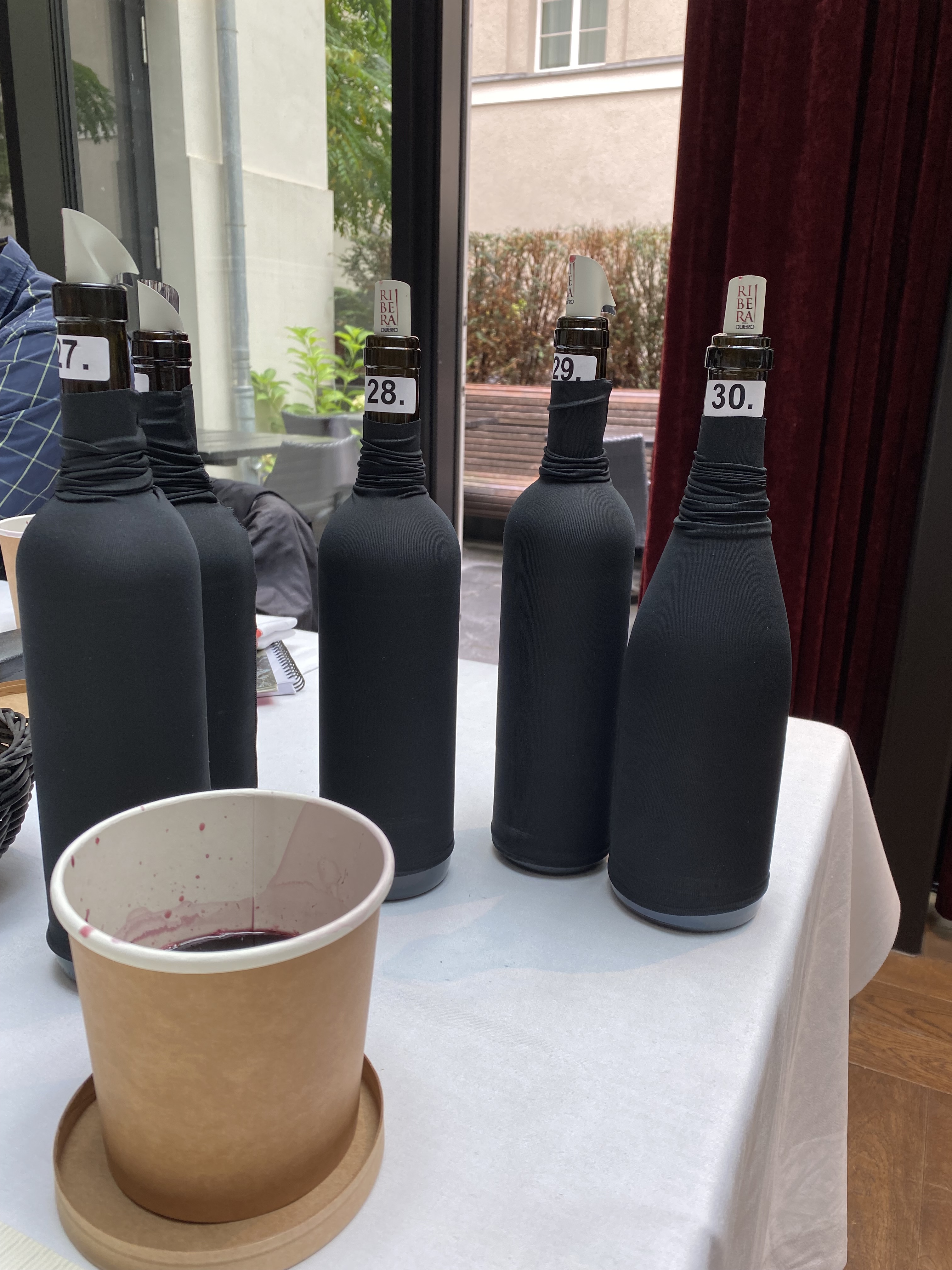 Präsentiert wurden uns die Flaschen erst nach der abgeschlossenen Veranstaltung. Während des Verkostens wurden sie mit ihren schwarzen Mäntelchen durch die Reihen gereicht. So wird generell bei solchen Veranstaltungen verhindert, dass jemand ein ihm bekanntes Weingut bevorzugt bewerten kann.