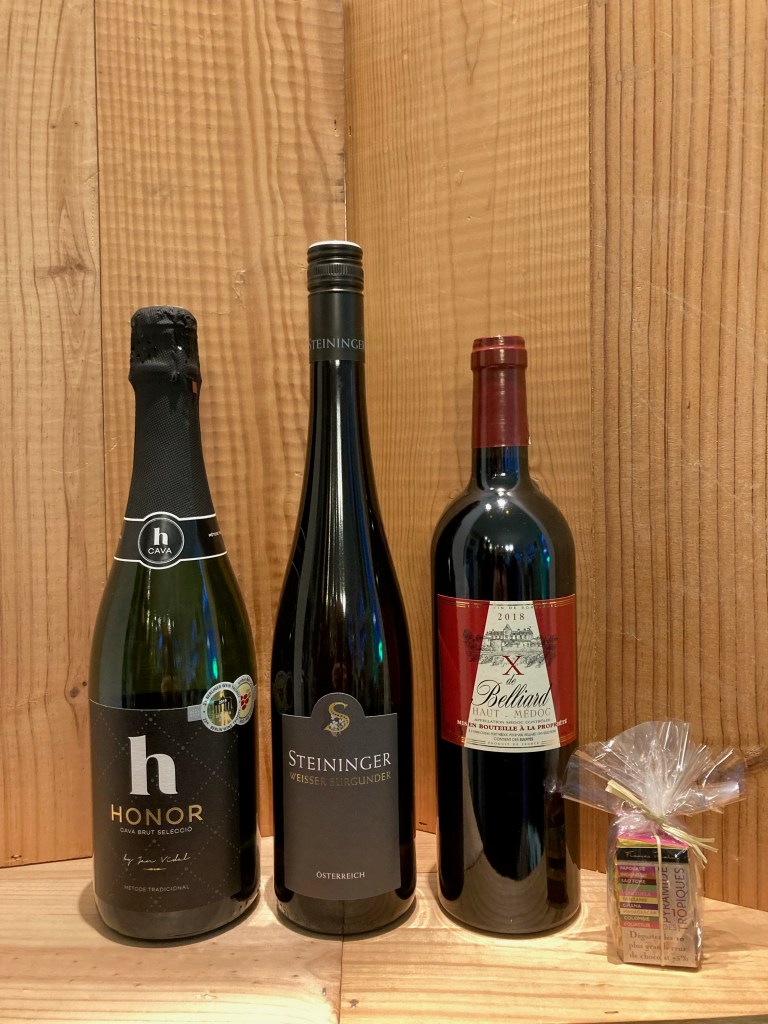 Diesmal könnt ihr euch entscheiden zwischen einem Weinpaket mit drei Weinen und einem Weinpaket inklusive einer Mini Schokoladenpyramide von Pralus.