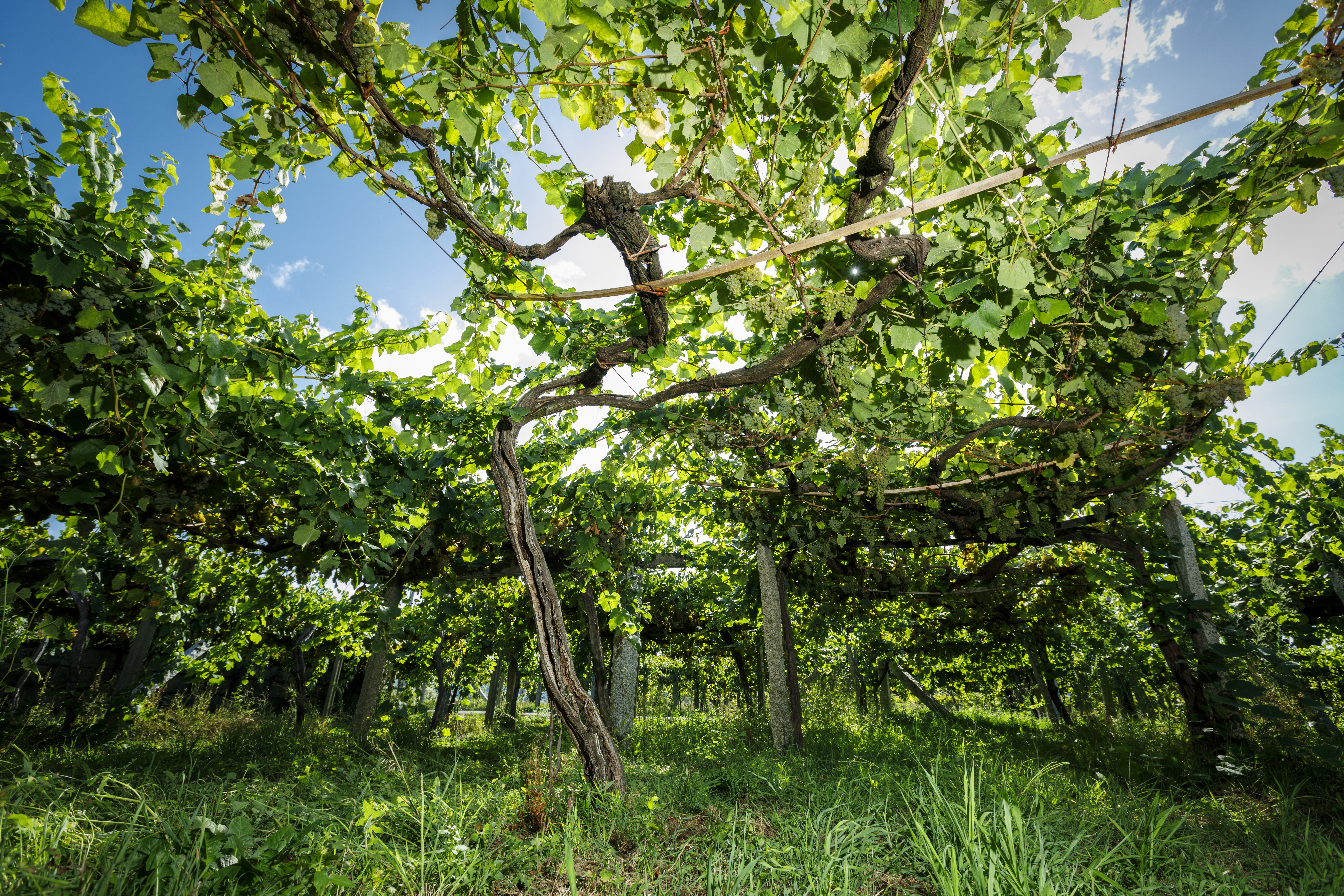 Das Foto zeigt die Pérgola Erziehung der Rebstöcke der Bodega Olga Wines in Rias Baixas.