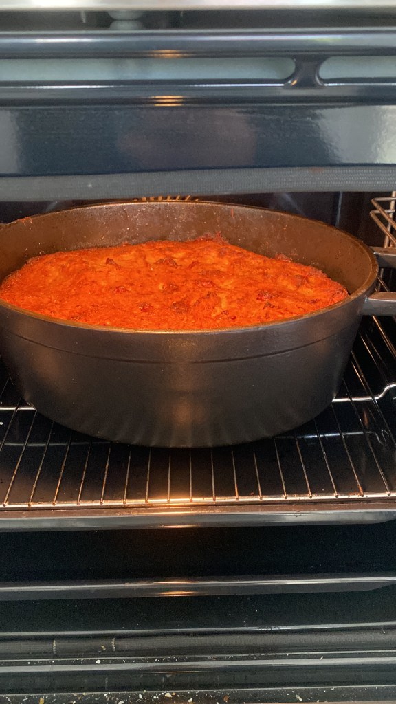 Topf mit Öl fetten. Ich empfehle Sonnenblumenöl. Wer hat, der kann die Schwartestücke auf den Boden legen. Darauf wird nun der Teig gegossen. Und schon geht es ab in den Ofen!