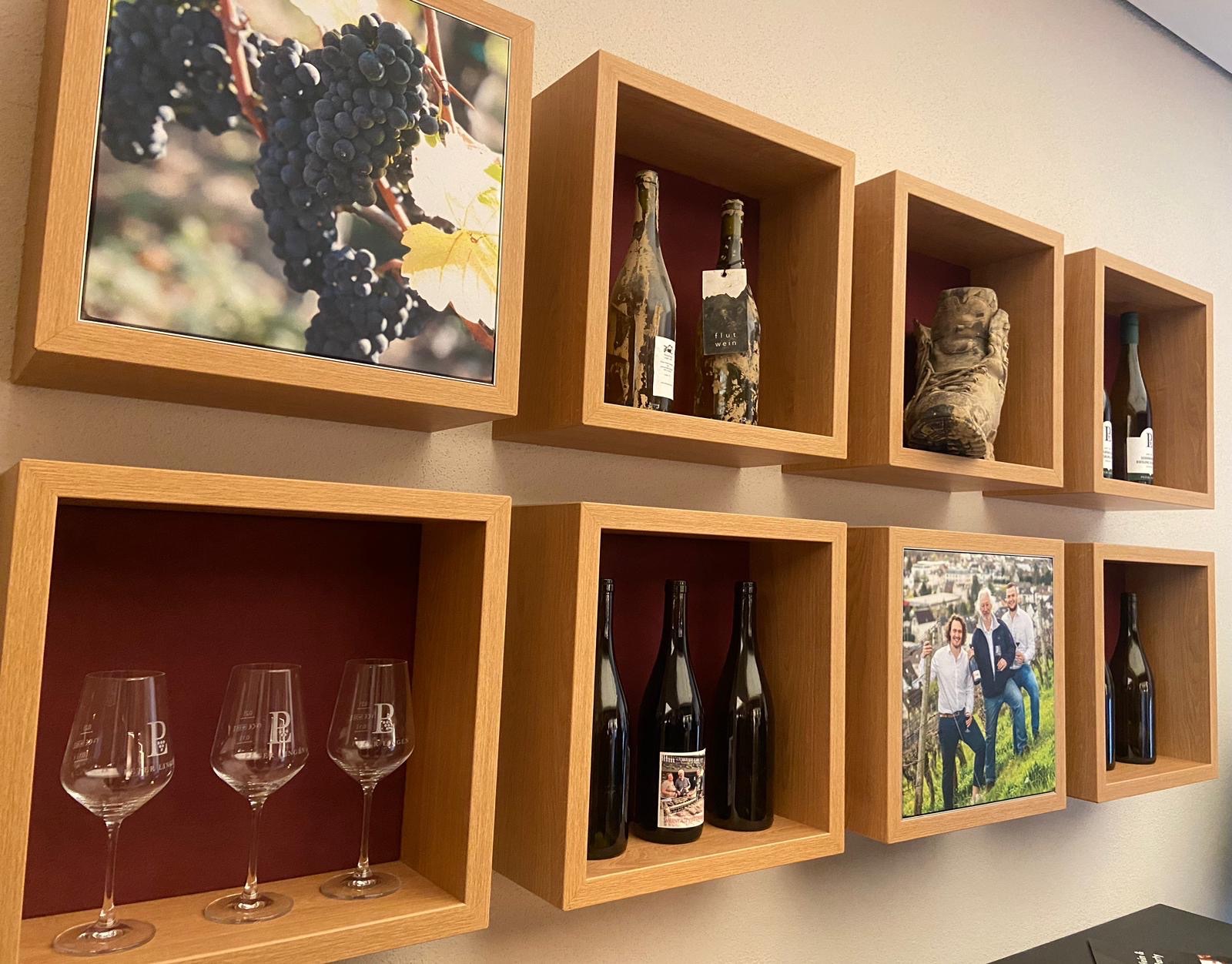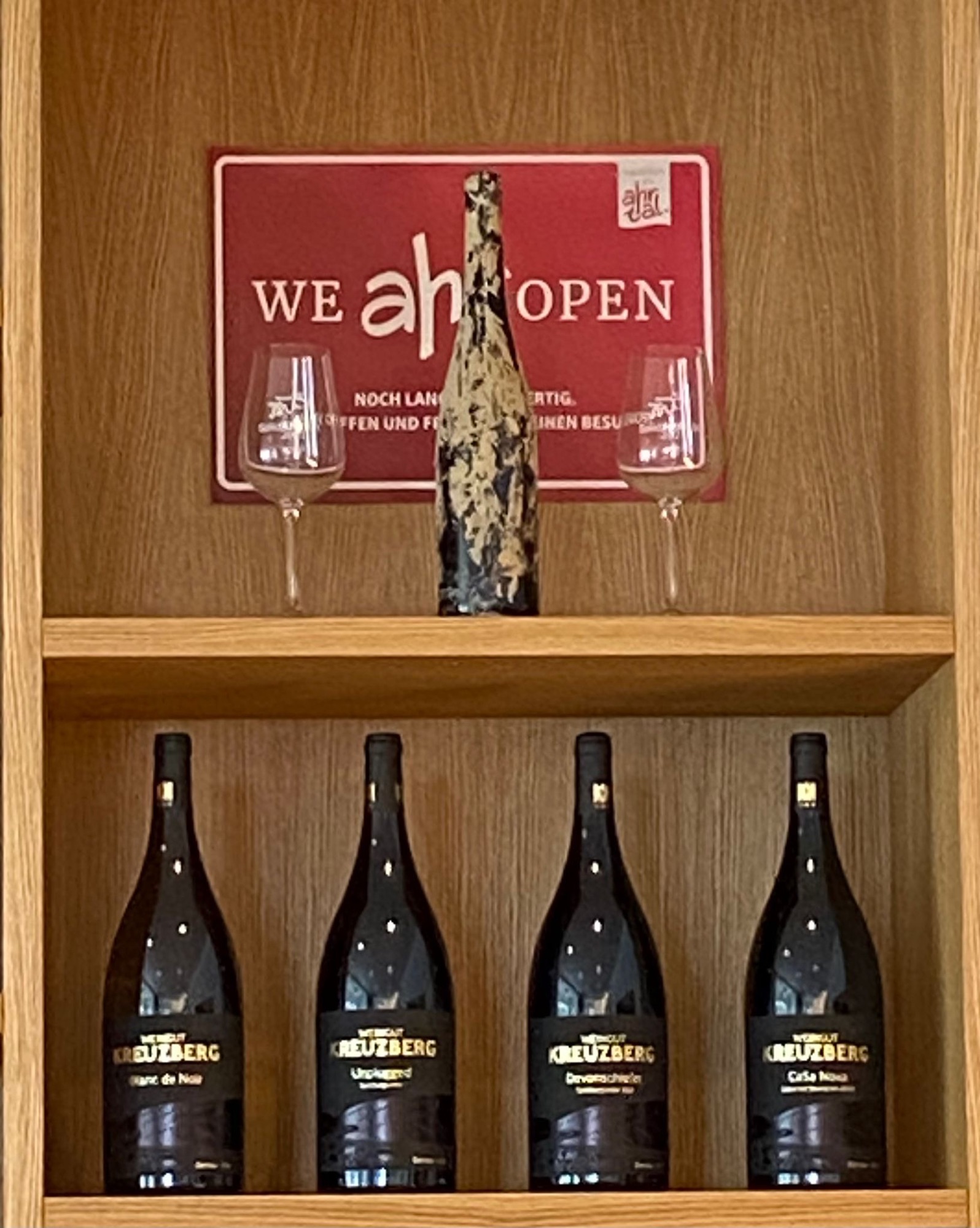 In der erst vor etwa drei Wochen neu aufgemachten Vinothek des Hauses machen wir eine Weinverkostung. Das nach der Flut komplett zerstörte Haus musste erst einmal mühevoll wieder saniert und aufgebaut werden. Wenn man jetzt drinnen sitzt in diesem hellen, freundlichen Raum mit Blick über die Hauptstraße von Dernau bis hin zum Ufer der Ahr, dann kann man sich nicht vorstellen, dass dieser kleine Bach einmal die Kraft hatte, um das alles wegzuspülen. Es ist schlicht unbegreiflich, nach wie vor.