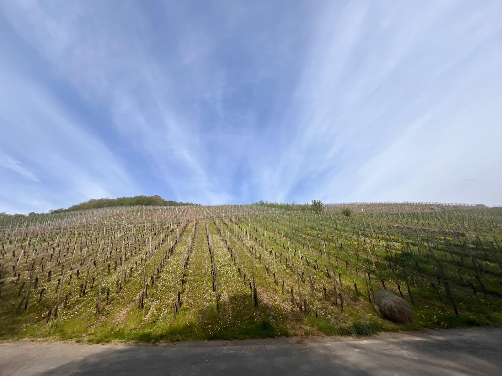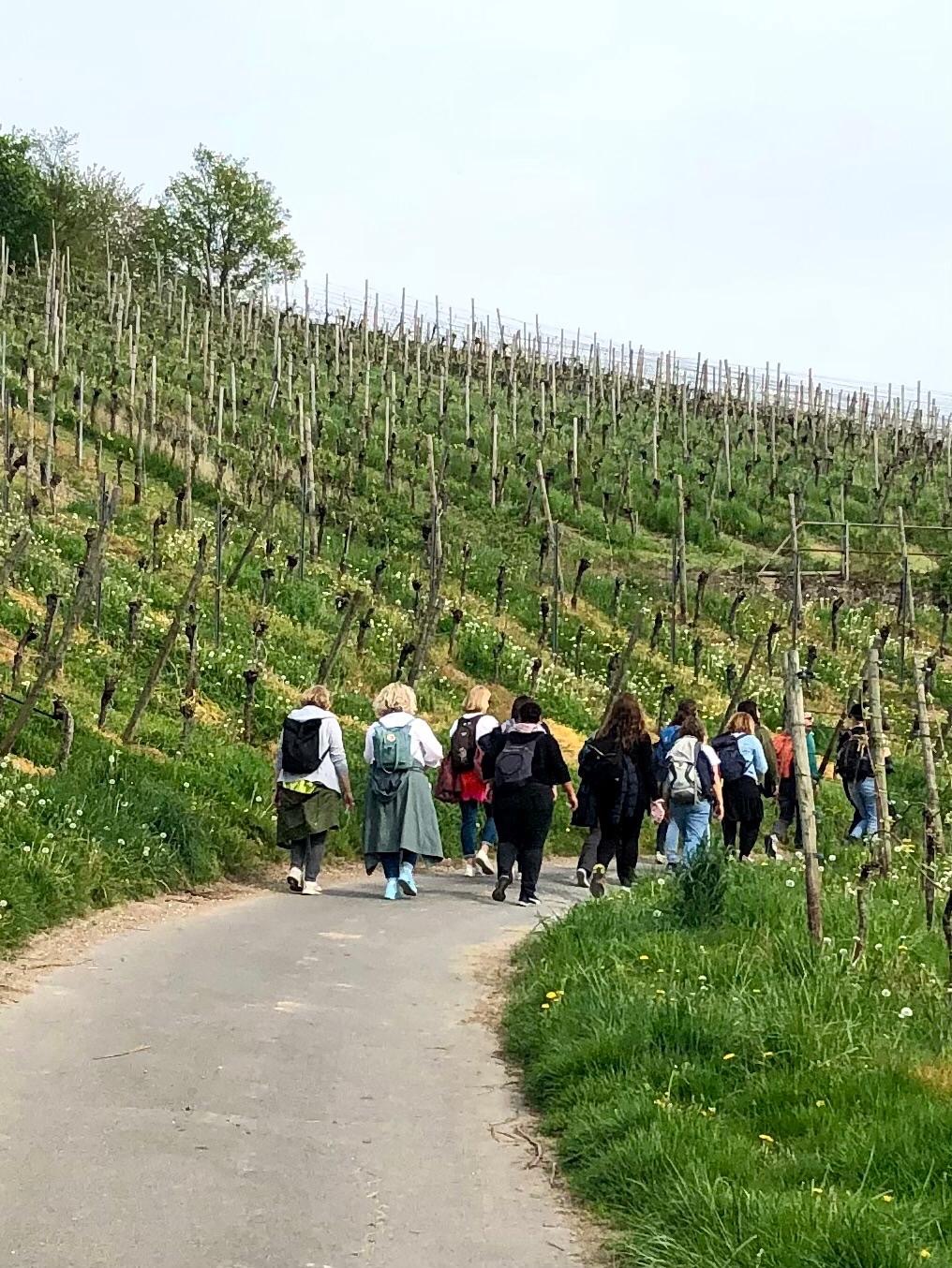 Deshalb sind wir froh danach wieder durch die herrlich warmen Weinberge des Rotweinwanderwegs laufen zu können. Und sind wir ehrlich: 90 Minuten Kriegsszenarien reichen in dieser angespannten Zeit. Da beschäftigen wir uns lieber schnell wieder mit den schönen Dingen des Lebens. Mit ein wenig Proviant im Rucksack laufen wir schnatternd und entspannt vom Regierungsbunker in Ahrweiler bis zu unserem Abschlussweinchen bei Familie Lingen in Bad Neuenahr. Ein Gruppenfoto im Weinberg war natürlich ein muss! Auch an einer Lage vom Weingut Kreuzberg kommen wir vorbei.