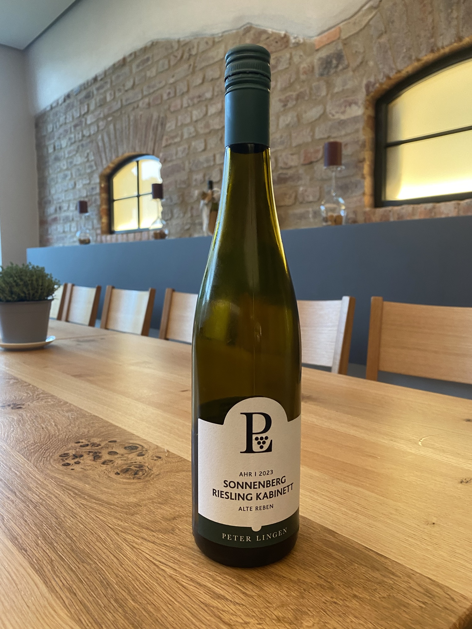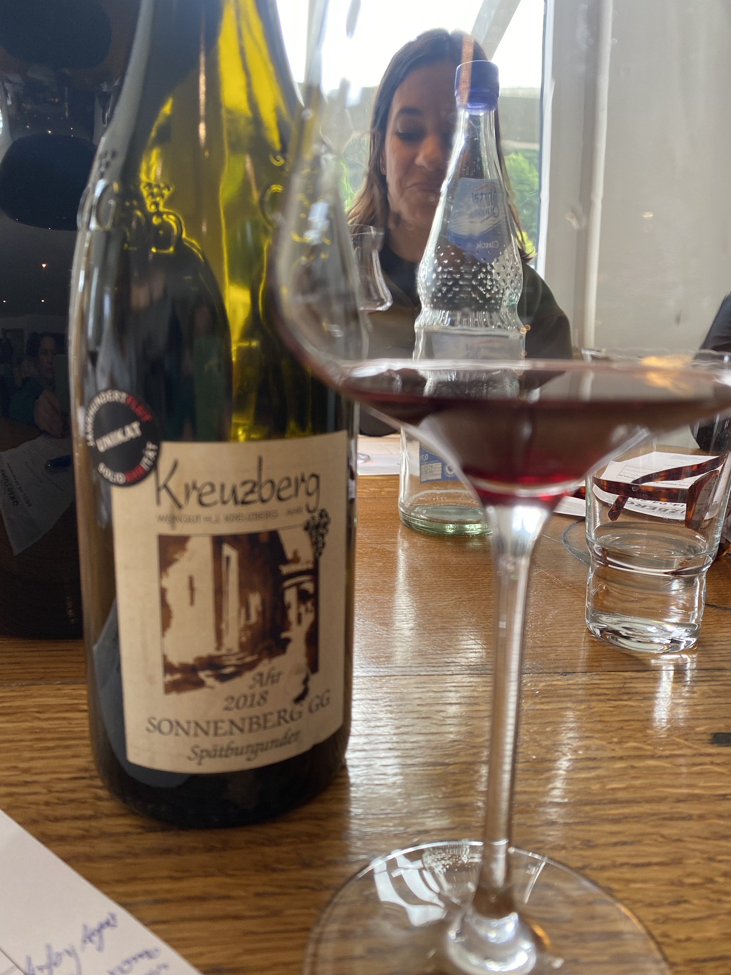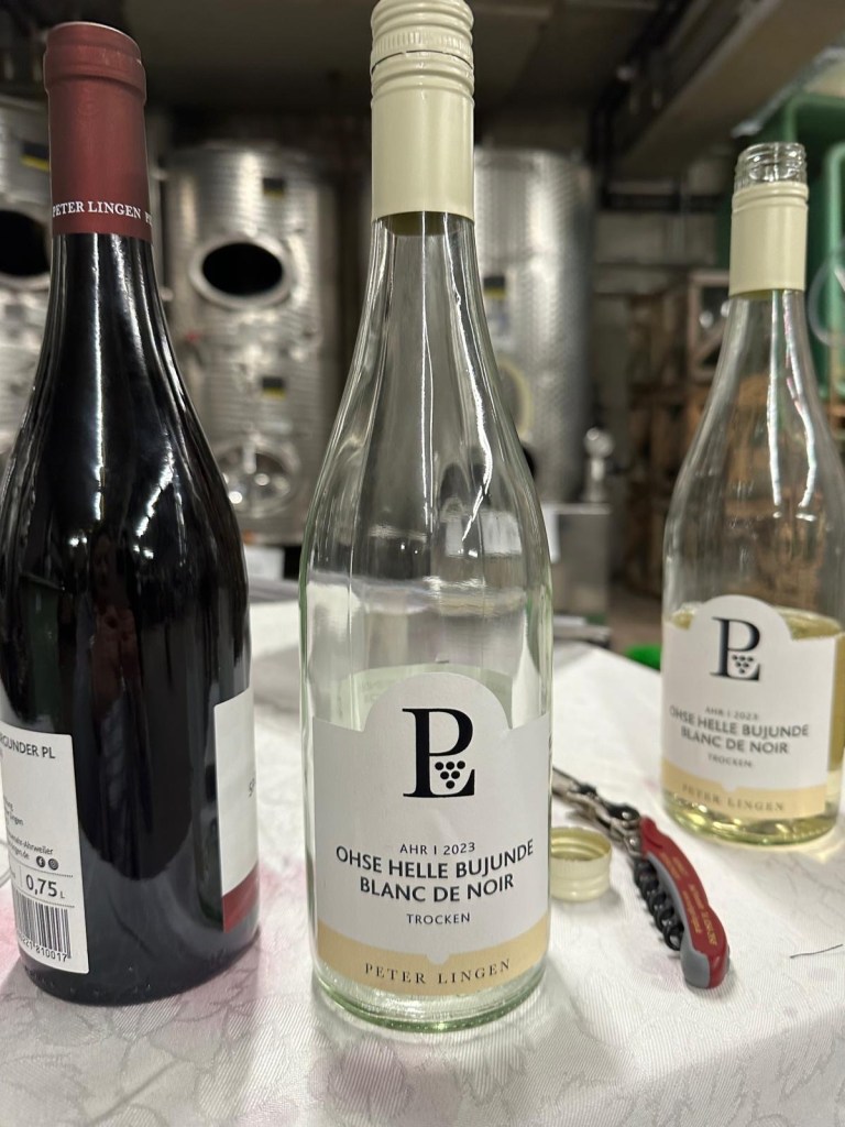 In unserer Verkostung probieren wir ein umfangreiches Spektrum von Blanc de Noir, also einem aus roten Spätburgundertrauben gekelterten Weißwein, über Früh- und Spätburgunder bis hin zu Flutwein, also aus dem Schlamm der Ahr gerettete Flaschen. Ein Rundumschlag in nur einer Stunde. Zu guter Letzt entdecke ich im Regal noch zwei Likörweine im Portweinstil. Einer davon ist eine Gemeinschaftsproduktion der sieben Ahr VdP Weingüter. Deshalb auch sein Name „Ahr 7“. Allerdings ist es erst 13.15 Uhr und wir haben heute noch viel vor.
