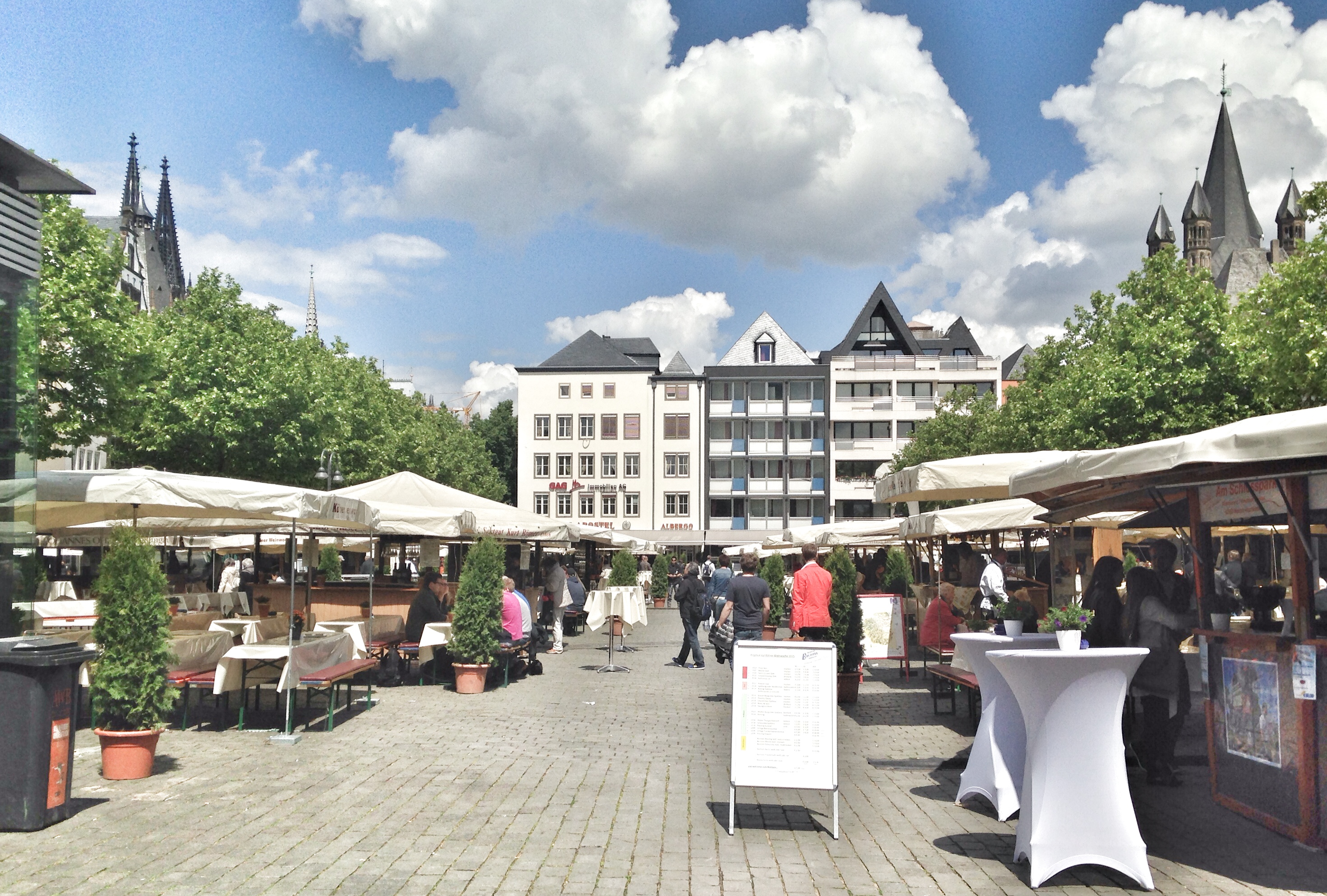 Unter den wachsamen Augen des Doms findet sie statt, die Kölner Weinwoche auf dem Heumarkt. Auch in diesem Jahr haben Winzer von Ahr, Saar und Neckar, aus der Pfalz, dem Rheingau und Rheinhessen ihre Buden aufgebaut. Auf den Bänken liegen Sitzkissen. Gehobene Ausstattung. Nix klassische Bierbank … Die Tische und Gänge sind mit Blumen dekoriert. Schon echt schick. Nachmittags eher von Rentnern besucht, ist das Publikum am Abend gemischt. Straßenmusikanten laufen zwischen den Buden und Bänken umher. Nette, gesellige Stimmung.