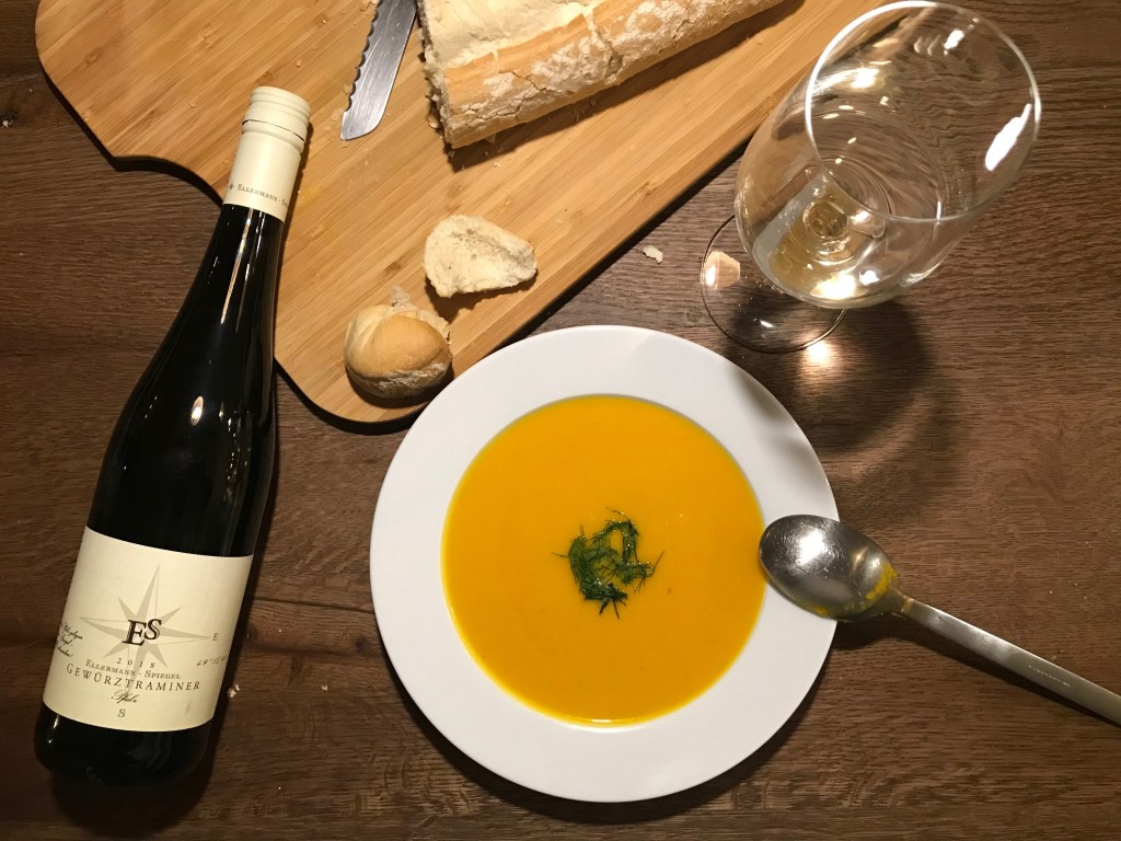 Vegane Kürbissuppe gepaart mit einem veganen Pfälzer Gewürztraminer.